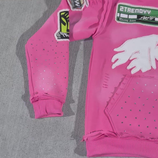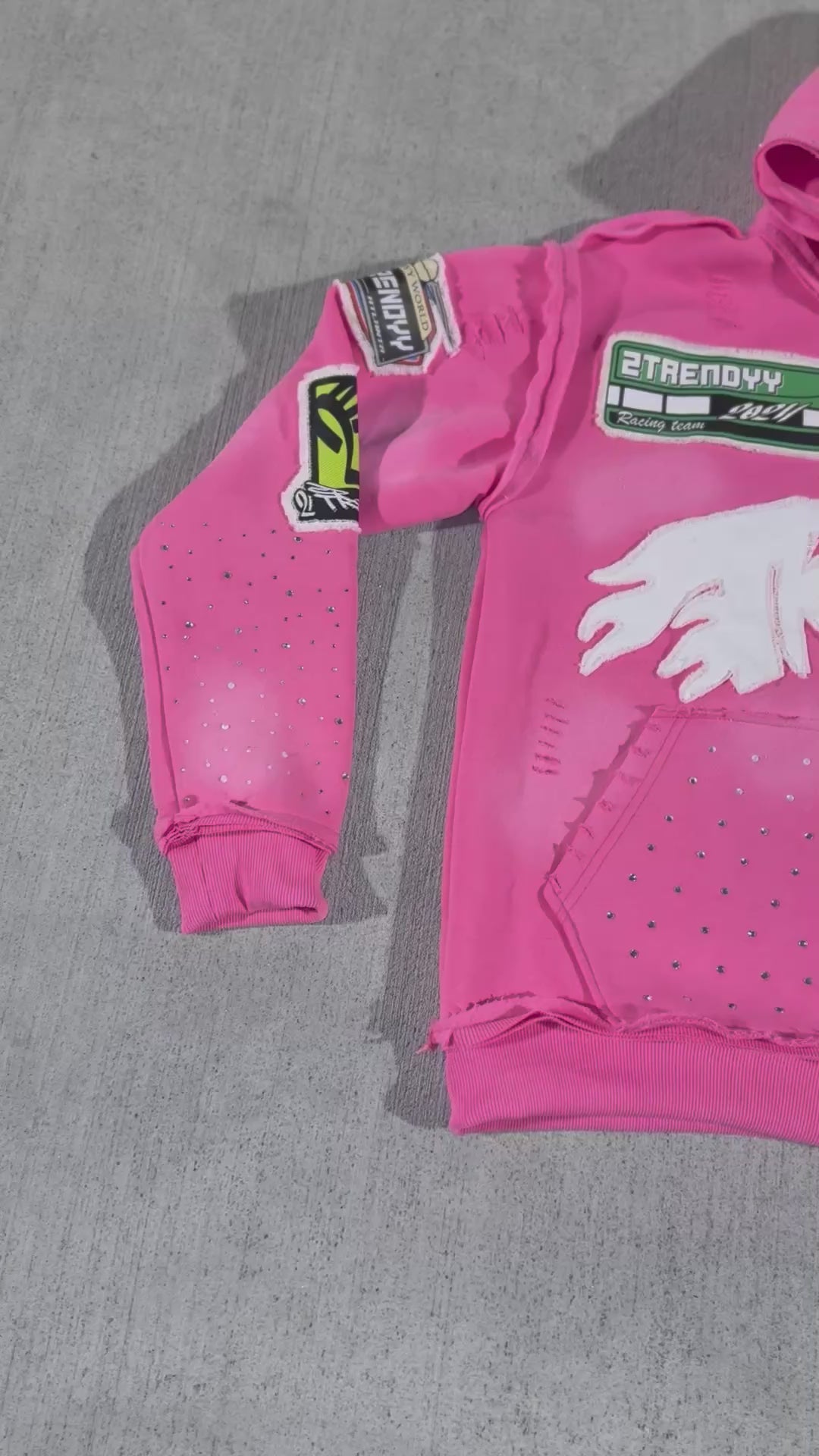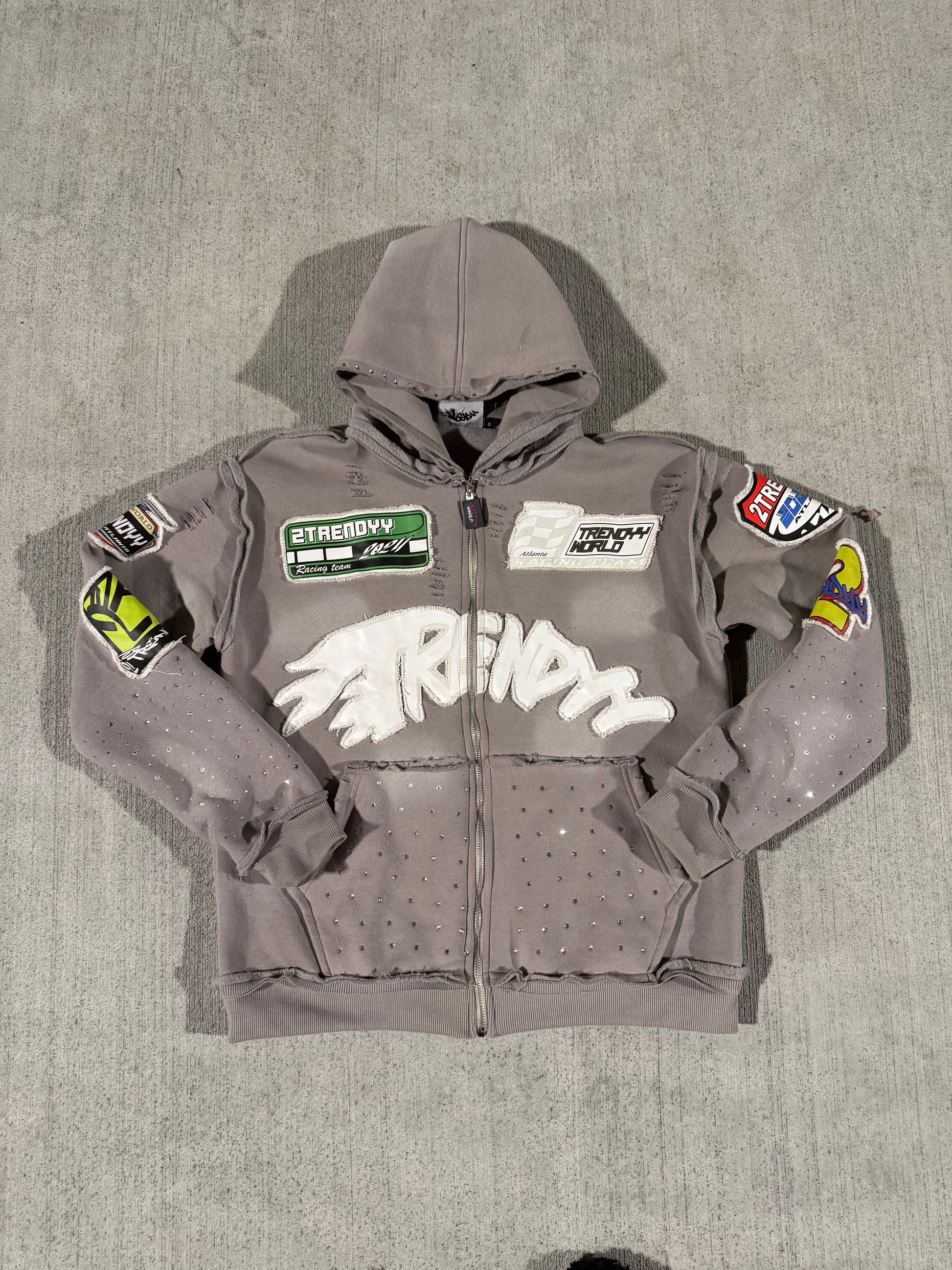 Rev up your style with this bold 2TrendyyCo Racing Hoodie. Featuring vibrant fabric, eye-catching patchwork, and graffiti-style “Trendyy” lettering across the chest, this zip-up hoodie brings streetwear and motorsport vibes together. Finished with rhinestone detailing on the pockets and sleeves for a standout edge.